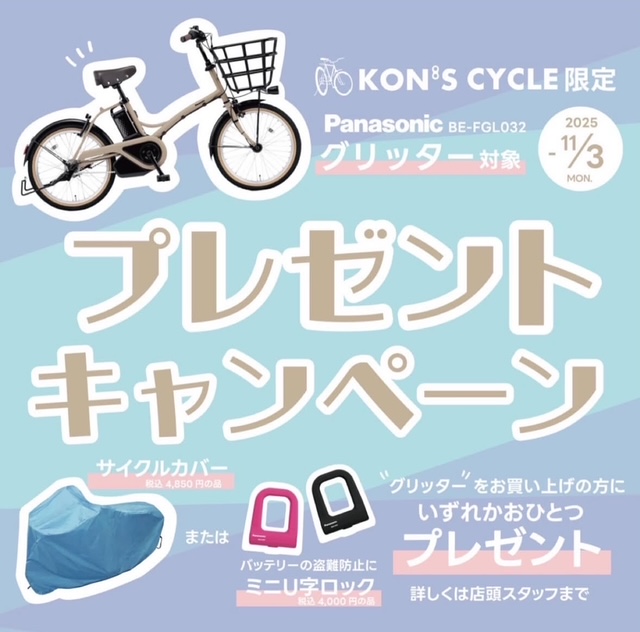 11月3日までの期間中に、コンズサイクルでパナソニックの電動自転車「グリッター」をご購入いただくと、