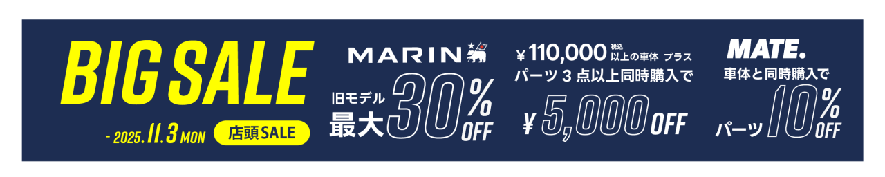 MARIN BIKES → ‘23、’24年モデルが30%(現金)・25%(その他)off。‘25モデルは20%(現金)・15%(その他)off。