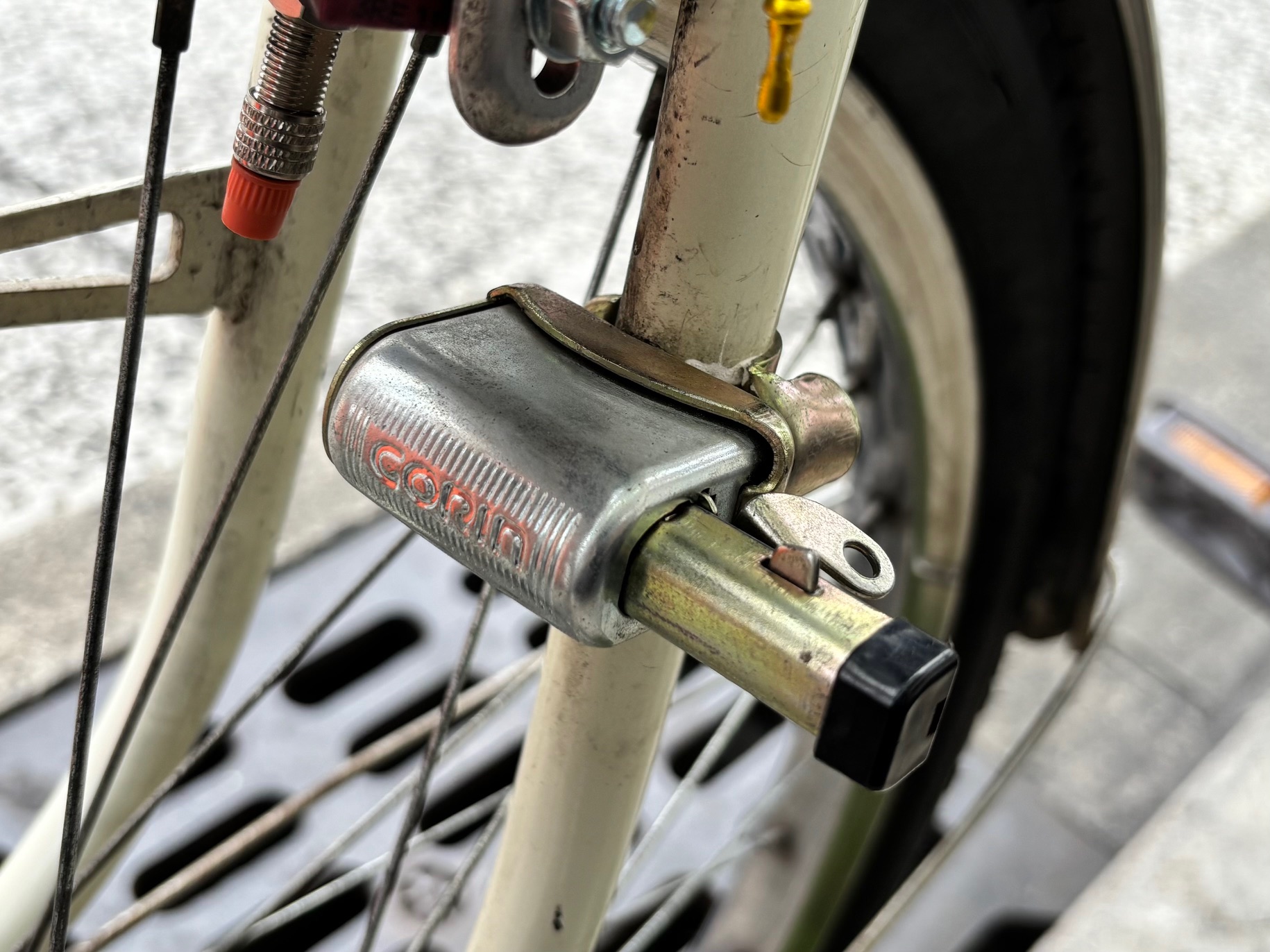 「箱錠」と呼ばれる前輪に取付けるタイプのカギなんです!