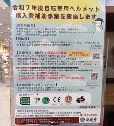 ただいまー京都市がヘルメット購入に際し、¥2000の補助を行っています。