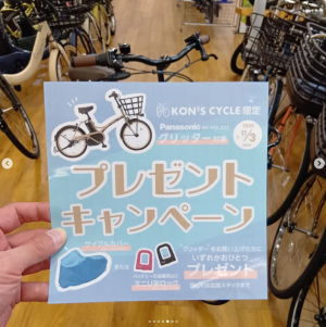🟡また、11月3日までの期間中に、コンズサイクルでパナソニックの電動自転車「グリッター」をご購入いただくと、サイクルカバー(4,850円の品)orミニU字ロック(4,000円の品)をいずれかおひとつプレゼント。