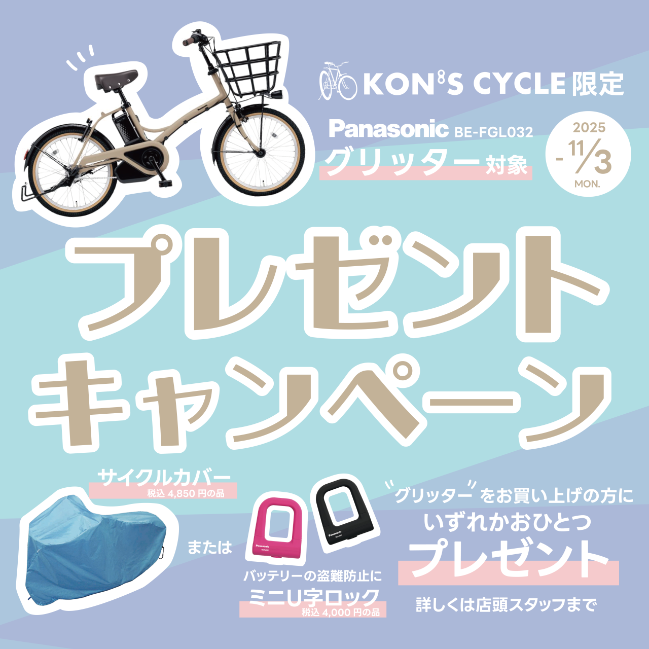 今!Panasonicの電動自転車、グリッターを購入するとサイクルカバーまたはミニU字ロックのいずれかをプレゼント!